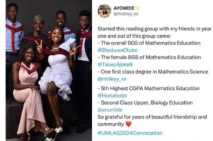 A University of Lagos student, Ayomide, recently shared the impressive academic achievements of her reading group following their graduation. Ayomide, who was part of the group formed during their first year, proudly celebrated the accomplishments of her friends on social media. According to Ayomide’s post, members of the group achieved notable academic success. Ifeoluwa Olubo emerged as the …