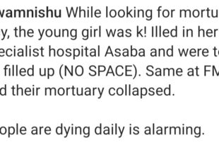 Harrison Gwamnishu, a human rights activist, has disclosed that mortuaries are filled beyond their capacity. He added that the body of a young lady, Chinagorom Lucy, who was found murdred in her home in Asaba, Delta State, was taken to multiple mortuaries but they could not take her in because they had no space. He concluded that “the rate at which people …