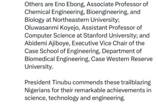 Nigeria’s President, Bola Tinubu has lauded six accomplished Nigerian scientists and engineers who have been named among the 400 recipients of the prestigious Presidential Early Career Award for Scientists and Engineers (PECASE) in the United States. The award, established in 1996 by former US President Bill Clinton, is the highest honour granted by the US government to outstanding scientists …