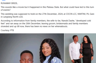 A bride-to-be identified as Nansik Dashe, reportedly ran away one day to her wedding in Plateau State. The wedding between Nansik and Kapnan Daniel Ventur, was scheduled to be held on December 27, 2024, at COCIN LCC, NIMTIM, PIL Gani in Langtang North Local Government Area of the state. It was gathered that Dashe disappeared on …