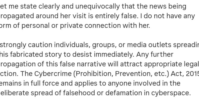 “Let me state clearly and unequivocally that the news being propagated around her visit is entirely false. I do not have any form of personal or private connection with her.”